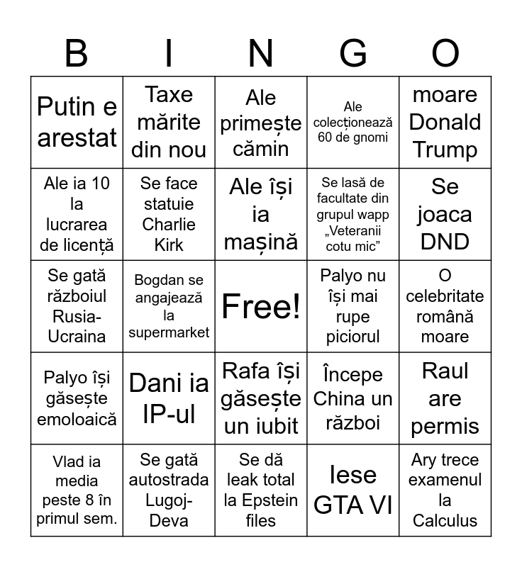 This bingo card has a free space and 24 words: Dani ia IP-ul, Se gată autostrada Lugoj-Deva, Ale își ia mașină, Vlad ia media peste 8 în primul sem., moare Donald Trump, Putin e arestat, Ale ia 10 la lucrarea de licență, Taxe mărite din nou, Palyo nu își mai rupe piciorul, Rafa își găsește un iubit, Se lasă de facultate din grupul wapp „Veteranii cotu mic”, Se gată războiul Rusia-Ucraina, Începe China un război, Raul are permis, Se face statuie Charlie Kirk, Iese GTA VI, O celebritate română moare, Ale primește cămin, Se joaca DND, Bogdan se angajează la supermarket, Ary trece examenul la Calculus, Palyo își găsește emoloaică, Ale colecționează 60 de gnomi and Se dă leak total la Epstein files.
