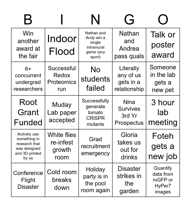 This bingo card has 25 words: White flies re-infest growth room, Holiday party is in the pool room again, No students failed, Conference Flight Disaster, Talk or poster award, Win another award at the fair, 6+ concurrent undergrad researchers, Indoor Flood, Nina Survives 3rd Yr Prospectus, Grad recruitment emergency, Literally any of us gets in a relationship, Root Grant Funded, Gloria takes us out for drinks, Foteh gets a new job, Successful Redox Proteomics run, Quantify data from roGFP or HyPer7 images, 3 hour lab meeting, Nathan and Andy win a single intramural game (any sport), Someone in the lab gets a new pet, Muday Lab paper accepted, Successfully generate tomato CRISPR mutants, Cold room breaks down, Actively use something in research that was designed and 3D printed by us, Nathan and Andrea pass quals and Disaster strikes in the garden.