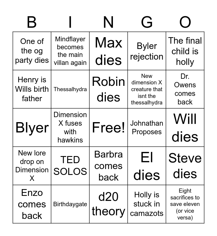 This bingo card has a free space and 24 words: TED SOLOS, Birthdaygate, Robin dies, Enzo comes back, The final child is holly, One of the og party dies, Henry is Wills birth father, Mindflayer becomes the main villan again, Johnathan Proposes, Barbra comes back, New dimension X creature that isnt the thessalhydra, Blyer, El dies, Steve dies, Thessalhydra, Holly is stuck in camazots, Will dies, Max dies, Dr. Owens comes back, Dimension X fuses with hawkins, Eight sacrifices to save eleven (or vice versa), New lore drop on Dimension X, Byler rejection and d20 theory.