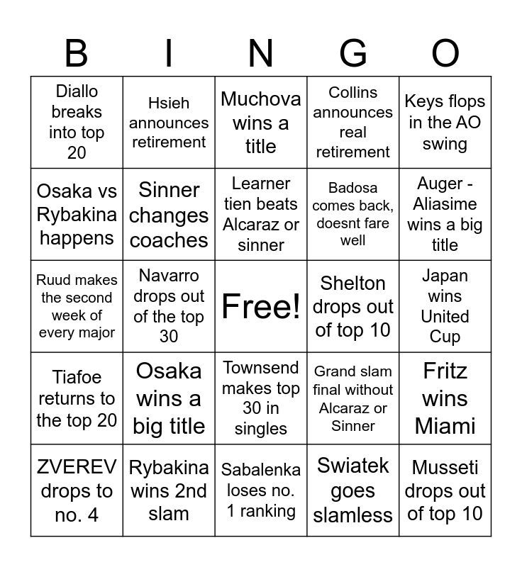 This bingo card has a free space and 24 words: Osaka wins a big title, Rybakina wins 2nd slam, Learner tien beats Alcaraz or sinner, ZVEREV drops to no. 4, Keys flops in the AO swing, Diallo breaks into top 20, Osaka vs Rybakina happens, Hsieh announces retirement, Shelton drops out of top 10, Townsend makes top 30 in singles, Badosa comes back, doesnt fare well, Ruud makes the second week of every major, Grand slam final without Alcaraz or Sinner, Fritz wins Miami, Sinner changes coaches, Swiatek goes slamless, Japan wins United Cup, Muchova wins a title, Auger -Aliasime wins a big title, Navarro drops out of the top 30, Musseti drops out of top 10, Tiafoe returns to the top 20, Collins announces real retirement and Sabalenka loses no. 1 ranking.