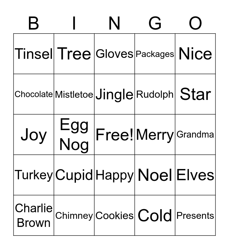 This bingo card has a free space and 24 words: Cupid, Chimney, Jingle, Charlie Brown, Nice, Tinsel, Chocolate, Tree, Merry, Happy, Rudolph, Joy, Noel, Elves, Mistletoe, Cold, Grandma, Gloves, Star, Egg Nog, Presents, Turkey, Packages and Cookies.