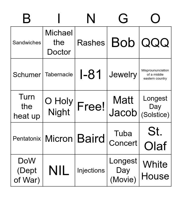 This bingo card has a free space and 24 words: Micron, NIL, I-81, DoW (Dept of War), QQQ, Sandwiches, Schumer, Michael the Doctor, Matt Jacob, Baird, Jewelry, Turn the heat up, Tuba Concert, St. Olaf, Tabernacle, Longest Day (Movie), Longest Day (Solstice), Rashes, Misproununciation of a middle eastern country, O Holy Night, White House, Pentatonix, Bob and Injections.