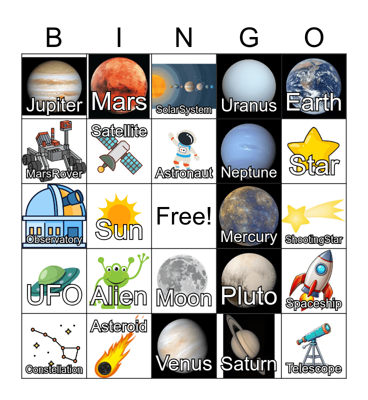 This bingo card has 24 images, a free space and 24 words: Alien, Asteroid, Astronaut, Constellation, Earth, Jupiter, MarsRover, Mars, Mercury, Moon, Neptune, Observatory, Pluto, Spaceship, Satellite, Saturn, ShootingStar, SolarSystem, Star, Sun, Telescope, UFO, Uranus and Venus.