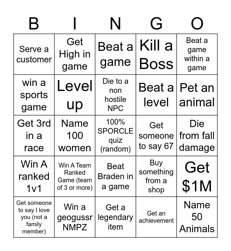 This bingo card has 25 words: Win A Team Ranked Game (team of 3 or more), Get a legendary item, Die to a non hostile NPC, Get someone to say I love you (not a family member), Beat a game within a game, Serve a customer, win a sports game, Get High in game, Get someone to say 67, Beat Braden in a game, Beat a level, Get 3rd in a race, Buy something from a shop, Get $1M, Level up, Name 50 Animals, Die from fall damage, Beat a game, Pet an animal, Name 100 women, 100% SPORCLE quiz (random), Win a geogussr NMPZ, Win A ranked 1v1, Kill a Boss and Get an achievement.