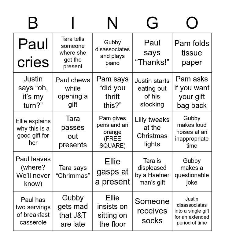 This bingo card has a free space and 24 words: Tara says “Chrimmas”, Gubby gets mad that J&T are late, Pam says “did you thrift this?”, Paul has two servings of breakfast casserole, Pam folds tissue paper, Paul cries, Justin says “oh, it’s my turn?”, Tara tells someone where she got the present, Lilly tweaks at the Christmas lights, Ellie gasps at a present, Justin starts eating out of his stocking, Ellie explains why this is a good gift for her, Tara is displeased by a Haefner man’s gift, Gubby makes a questionable joke, Paul chews while opening a gift, Someone receives socks, Gubby makes loud noises at an inappropriate time, Gubby disassociates and plays piano, Pam asks if you want your gift bag back, Tara passes out presents, Justin disassociates into a single gift for an extended period of time, Paul leaves (where? We’ll never know), Paul says “Thanks!” and Ellie insists on sitting on the floor.