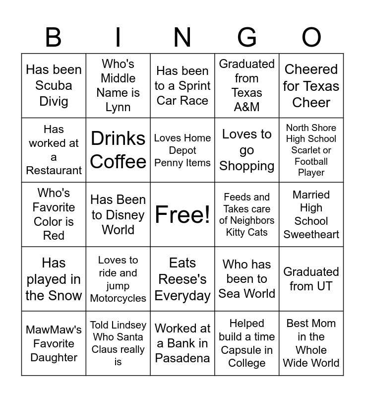 This bingo card has a free space and 29 words: MawMaw's Favorite Daughter, Loves Ice Cream & Bends the Spoon, Has Been to Disney World, Has Seen the Eifel Tower in Person, Has been Scuba Divig, Has been to a Sprint Car Race, Drinks Coffee, Loves to ride and jump Motorcycles, Feeds and Takes care of Neighbors Kitty Cats, Told Lindsey Who Santa Claus really is, Married High School Sweetheart, Best Mom in the Whole Wide World, Worked at a Bank in Pasadena, Helped build a time Capsule in College, North Shore High School Scarlet or Football Player, Who's Nickname is Big Dog, Eats Reese's Everyday, Has played in the Snow, Cheered for Texas Cheer, Who's Favorite Color is Red, Who has been to Sea World, Loves & Kisses Weenie Dogs, Loves to go Shopping, Has worked at a Restaurant, Graduated from Texas A&M, Who's Middle Name is Lynn, Graduated from UT, Loves Home Depot Penny Items and Has been To FLorida.