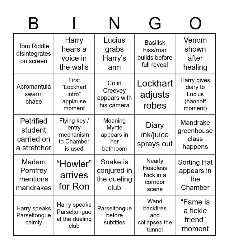 This bingo card has 92 words: Free!, Green light in diary scene, Parseltongue before subtitles, Basilisk POV reflection, Diary ink speeds up, Lockhart spell fails, Sword appears unasked, Harry speaks Parseltongue calmly, Fawkes arrives exactly on cue, Snake shadows in corridors, Chamber doors counter-rotate, Lucius nearly curses Harry, Dobby flinches at punishment, Lockhart adjusts robes, Ron hangs out of Ford Anglia, Venom shown after healing, Lucius grabs Harry’s arm, Diary reacts to emotion, Chamber taller than Great Hall, Harry trapped behind the barrier at King’s Cross, Arthur Weasley yells about “flying” the car, Ford Anglia takes off from a road, Whomping Willow attack, Harry and Ron in Filch’s office, “Howler” arrives for Ron, First “Lockhart intro” applause moment, Lockhart signs a photo / book on screen, “Fame is a fickle friend” moment, Dueling Club is announced, Snape and Lockhart demonstrate Expelliarmus, Harry speaks Parseltongue at the dueling club, Snake is conjured in the dueling club, “Enemies of the heir, beware” message appears, Mrs Norris is found petrified, Harry hears a voice in the walls, Spiders appear in a corridor shot, Students hold mirrors as protection, Justin Finch-Fletchley is in a scene, Colin Creevey appears with his camera, Nearly Headless Nick in a corridor scene, Petrified student carried on a stretcher, Madam Pomfrey mentions mandrakes, Mandrake greenhouse class happens, Polyjuice Potion plan is stated, Moaning Myrtle appears in her bathroom, Hair in the Polyjuice Potion reveal, Crabbe/Goyle polyjuice scene (as them), Cat transformation mishap is shown, Slytherin common room set is shown, Tom Riddle diary first writing response, Diary shows a memory sequence, Hagrid is taken away by Ministry officials, Dumbledore is removed from Hogwarts, Students in the Great Hall react to an announcement, “Aragog” name is said, Follow-the-spiders moment, Aragog full reveal, Acromantula swarm chase, Ford Anglia returns and rescues them, Flying key / entry mechanism to Chamber is used, Sink tap with snake engraved is shown, Parseltongue opens the Chamber entrance, Harry and Ron slide down the tunnel, Cave of bones shot, Lockhart tries to Obliviate, Wand backfires and collapses the tunnel, Ron separated from Harry by rocks, Harry enters the Chamber alone, Statue of Salazar Slytherin appears, Ginny is found unconscious, Tom Riddle steps out of the diary, Riddle explains the diary’s effect, Basilisk hiss/roar builds before full reveal, Basilisk full reveal shot, Basilisk lunges at Harry, Fawkes arrives in the Chamber, Sorting Hat appears in the Chamber, Sword of Gryffindor appears, Fawkes attacks Basilisk eyes, Basilisk fang pierces Harry’s arm, Harry stabs the diary with the fang, Diary ink/juice sprays out, Tom Riddle disintegrates on screen, Fawkes tears are applied to the wound, Phoenix carries Harry and Ginny out, Hagrid returns to Hogwarts, Lockhart shown at St Mungo’s-style ward scene, Dobby is freed (sock reveal), Lucius reacts to Dobby’s freedom, Hogwarts cheering ending scene, Harry gives diary to Lucius (handoff moment) and Hogwarts feast / celebration scene.