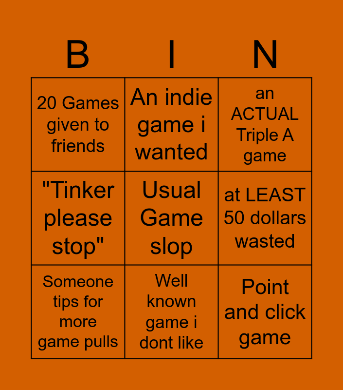 This bingo card has a free space and 8 words: at LEAST 50 dollars wasted, an ACTUAL Triple A game, An indie game i wanted, Someone tips for more game pulls, 20 Games given to friends, Point and click game, "Tinker please stop" and Well known game i dont like.