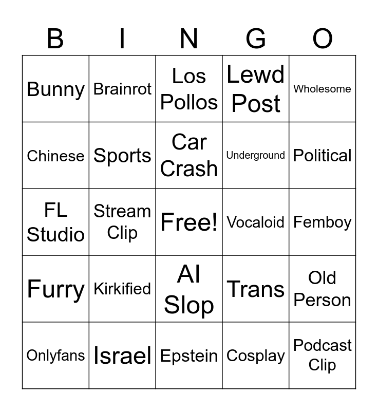 This bingo card has a free space and 24 words: Kirkified, Israel, Car Crash, Onlyfans, Wholesome, Bunny, Chinese, Brainrot, Vocaloid, AI Slop, Underground, FL Studio, Trans, Old Person, Sports, Cosplay, Femboy, Los Pollos, Political, Stream Clip, Podcast Clip, Furry, Lewd Post and Epstein.