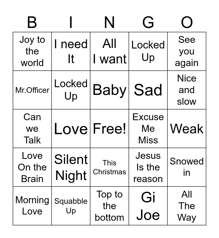 This bingo card has a free space and 24 words: Silent Night, Squabble Up, Baby, Morning Love, See you again, Joy to the world, Mr.Officer, I need It, Excuse Me Miss, This Christmas, Sad, Can we Talk, Jesus Is the reason, Snowed in, Locked Up, Gi Joe, Weak, All I want, Nice and slow, Love, All The Way, Love On the Brain, Locked Up and Top to the bottom.