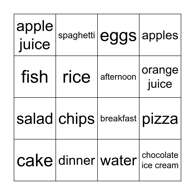 This bingo card has 24 words: bread, milk, orange juice, chicken, fish, apple juice, rice, spaghetti, dinner, steak, salad, breakfast, lunch, morning, afternoon, evening, water, eggs, chips, pizza, cake, chocolate ice cream, apples and bananas.
