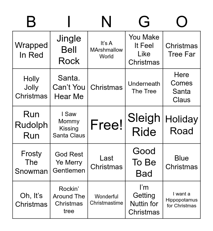 This bingo card has a free space and 62 words: Misteltoe, Rockin’ Around The Christmas tree, It’s The Most Wonderful Time Of The Year, Frosty The Snowman, Christmas Of love, Christmas Is, Santa. Can’t You Hear Me, Snowman, Underneath The Tree, Santa Tell Me, You Make It Feel Like Christmas, One More Sleep, Holly Jolly Christmas, My Favorite Things, My Kind Of Present, Wrapped In Red, I want a Hippopotamus for Christmas, Christmas Tree Far, Drummer Boy, Christmas, Sleigh Ride, It’s A MArshmallow World, Oh, It’s Christmas, I’m Getting Nuttin for Christmas, Linus and Lucy, I’ve Got My Love To Keep Me Warm, Pennies From Heaven, Carol of The Bells, Blue Christmas, Making Christmas, Winter in St Louis, What’s This ?, Surfin Santa, The 12 Days of Christmas, Holiday Road, Jingle Bell Rock, Winter Wonderland/ Sleigh Ride, All I Want For Christmas Is You, I Saw Mommy Kissing Santa Claus, Santa’s Got a Dirty Job, Run Rudolph Run, Christmas In Hollis, God Rest Ye Merry Gentlemen, Deck The Halls, Here Comes Santa Claus, Good To Be Bad, Let It Snow! Let It Snow! Let It Snow!, A Holly Jolly Christmas, What Christmas Means To Me, Santa Claus Is Coming To Town, Last Christmas, Wonderful Christmastime, The Chipmunk Song, Oh Santa, Baby It’s Cold Outside, Mistletoe And Holly, Holidays, Little Saint Nick, Feliz Navidad, Driving Home For Christmas, My Only Wish and Jingle Bells.