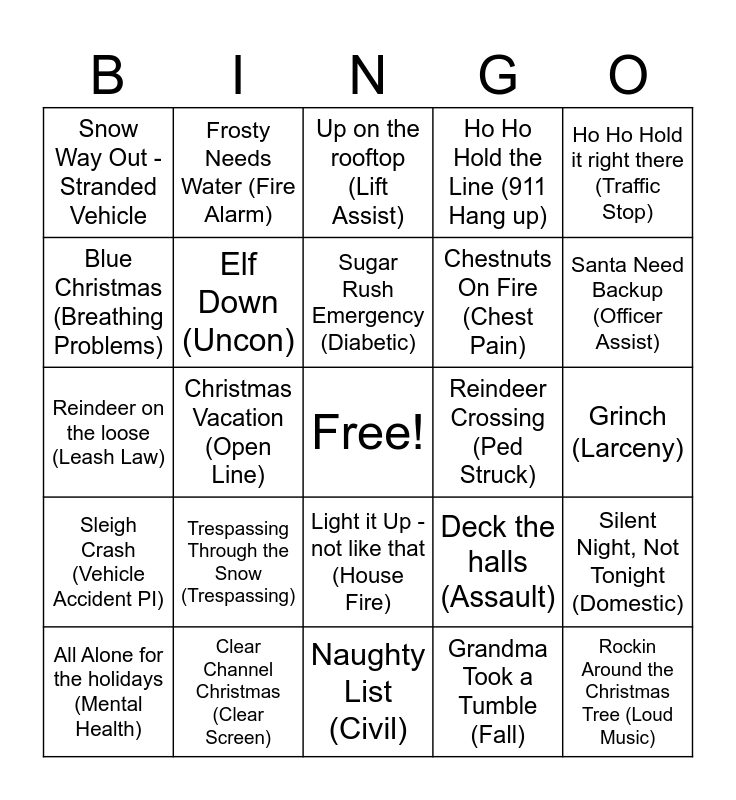 This bingo card has a free space and 28 words: Silent Night, Not Tonight (Domestic), Elf Gone Wild (Intox Subj), Chestnuts On Fire (Chest Pain), Grandma Took a Tumble (Fall), Blue Christmas (Breathing Problems), Up on the rooftop (Lift Assist), Frosty Needs Water (Fire Alarm), Sleigh Crash (Vehicle Accident PI), Reindeer Crossing (Ped Struck), All Alone for the holidays (Mental Health), Reindeer on the loose (Leash Law), Ho Ho Hold the Line (911 Hang up), Clear Channel Christmas (Clear Screen), Naughty List (Civil), Santa Need Backup (Officer Assist), Jingle Bell Jail (Arrest), Trespassing Through the Snow (Trespassing), Elf Down (Uncon), Sugar Rush Emergency (Diabetic), Light it Up - not like that (House Fire), Snow Way Out - Stranded Vehicle, Fender Bender Bells - Veh Acc PD, Rockin Around the Christmas Tree (Loud Music), Christmas Vacation (Open Line), Grinch (Larceny), Deck the halls (Assault), Ho Ho Hold it right there (Traffic Stop) and Jolly but Not Okay (General Sickness).