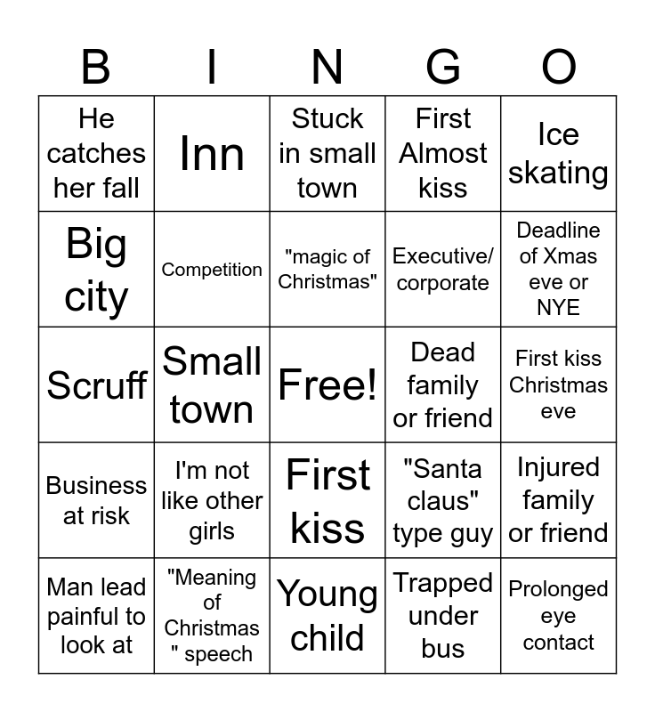 This bingo card has a free space and 40 words: Flanneled man, Scruff, Festival, Competition, "Meaning of Christmas " speech, First kiss, "magic of Christmas", Sidekick is POC - worse off/comedic heel, Ice skating, Business at risk, Small town, First Almost kiss, Prolonged eye contact, First kiss Christmas eve, Dead family or friend, I'm not like other girls, You're not like other girls, He catches her fall, Girl awkwardly falls, Stuck in small town, Injured family or friend, Trapped under bus, Executive/ corporate, Big city, Girl main character full beat makeup, Puffer vest, Henleys, Scarf straight down, Fake snow, Complains about temperature, Girl has straightened and then curled hair, Man lead painful to look at, Man lead actually cute, "Santa claus" type guy, Deadline of Xmas eve or NYE, Young child, Someone looks straight at camera, Single parent, Inn and Someone with no Christmas spirit.
