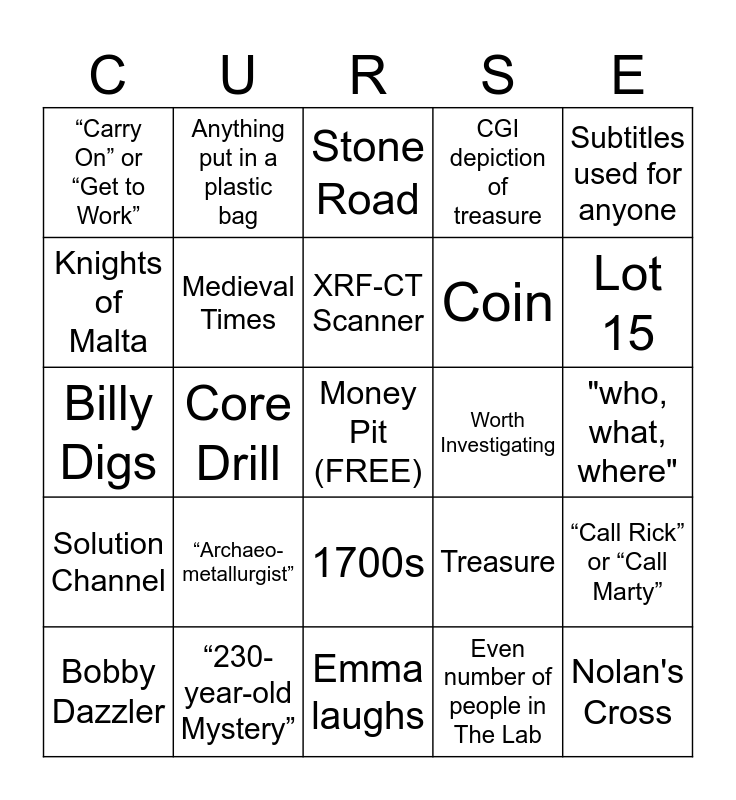 This bingo card has a free space and 24 words: “Archaeo-metallurgist”, “230-year-old Mystery”, XRF-CT Scanner, Bobby Dazzler, Subtitles used for anyone, “Carry On” or “Get to Work”, Knights of Malta, Anything put in a plastic bag, Worth Investigating, 1700s, Coin, Billy Digs, Treasure, “Call Rick” or “Call Marty”, Medieval Times, Even number of people in The Lab, "who, what, where", Stone Road, Lot 15, Core Drill, Nolan's Cross, Solution Channel, CGI depiction of treasure and Emma laughs.