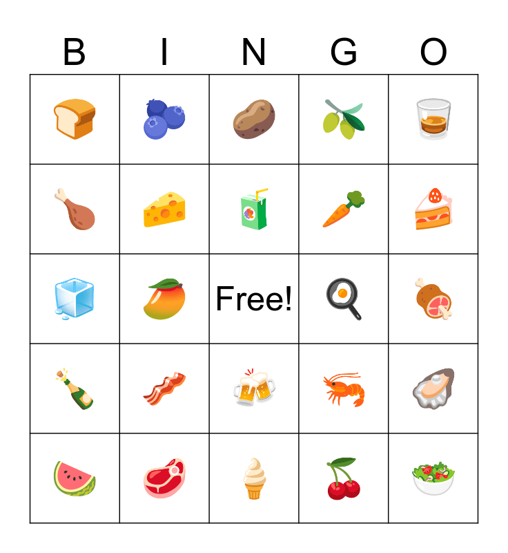 This bingo card has a free space and 29 words: 🍉, 🍇, 🥭, 🥒, 🍞, 🥔, 🧀, 🥓, 🍳, 🥩, 🍖, 🥗, 🍦, 🍒, 🍰, 🍪, 🍻, 🍾, 🥃, 🧊, 🦐, 🥞, 🥕, 🍗, 🫒, 🫐, 🦪, 🧃 and 🥝.