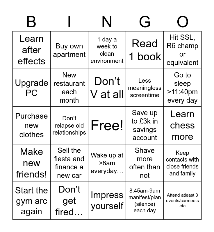 This bingo card has a free space and 24 words: Sell the fiesta and finance a new car, Don’t get fired…, Don’t V at all, Start the gym arc again, Hit SSL, R6 champ or equivalent, Learn after effects, Upgrade PC, Buy own apartment, Save up to £3k in savings account, Wake up at >8am everyday…, Less meaningless screentime, Purchase new clothes, Shave more often than not, Keep contacts with close friends and family, New restaurant each month, 8:45am-9am manifest/plan (silence) each day, Learn chess more, 1 day a week to clean environment, Go to sleep >11:40pm every day, Don’t relapse old relationships, Attend atleast 3 events/carmeets etc, Make new friends!, Read 1 book and Impress yourself.