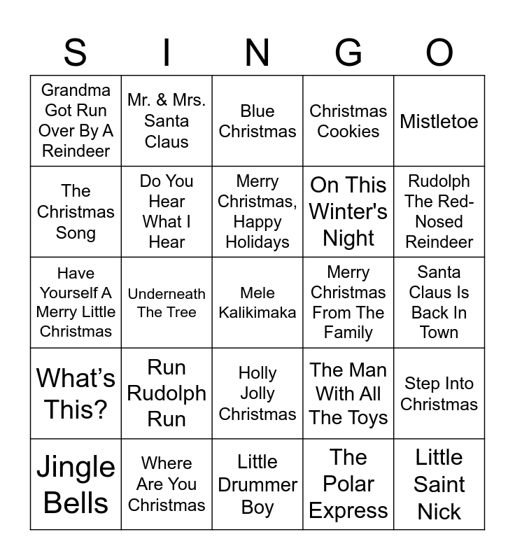 This bingo card has 80 words: Rockin’ Around The Christmas Tree, Silver Bells, Blue Christmas, Santa Claus Is Coming To Town, Wonderful Christmastime, Christmas Song, Sleigh Ride, Frosty The Snowman, There's No Place Like Home, Santa Baby, Jingle Bell Rock, Feliz Navidad, Christmas Cookies, Grandma Got Run Over By A Reindeer, You’re A Mean One Mr. Grinch, The Christmas Song, Christmas In Dixie, Run Rudolph Run, White Christmas, Santa Claus Is Back In Town, Hard Candy Christmas, Mistletoe, Have Yourself A Merry Little Christmas, Merry Christmas, Happy Holidays, Do You Hear What I Hear, Silent Night, All I Want For Christmas Is You, Mary, Did You Know?, I Saw Mommy Kissing Santa Claus, Let It Snow, Rudolph The Red-Nosed Reindeer, I Want A Hippopotamus For Christmas, Little Drummer Boy, Little Saint Nick, Jingle Bells, Merry Christmas From The Family, Up On The Housetop, My Favorite Things, Last Christmas, Mele Kalikimaka, Let It Be Christmas, Dominick The Donkey, All I Want For Christmas Is My Two Front Teeth, Please Come Home For Christmas, Pennies From Heaven, Mr. & Mrs. Santa Claus, Santa Looked A Lot Like Daddy, Winter Wonderland, A Marshmallow World, What Christmas Means To Me, Step Into Christmas, Underneath The Tree, The Man With All The Toys, Happy Xmas (War Is Over), Baby, It’s Cold Outside, I’ll Be Home For Christmas, It’s The Most Wonderful Time Of The Year, Deck The Halls, Santa Tell Me, Holly Jolly Christmas, On This Winter's Night, I Heard The Bells On Christmas Day, Please, Daddy (Don’t Get Drunk This Christmas), The Man With The Bag, O Come All Ye Faithful, Put A Little Holiday In Your Heart, O Christmas Tree, I’ve Got My Love To Keep Me Warm, Christmas All Over Again, Holiday Road, What’s This?, Where Are You Christmas, Do You Want To Build A Snowman, Rockin’ On Top Of The World, Christmas Is All Around, Christmas Vacation, The Polar Express, O Little Town Of Bethlehem, When It’s Christmas Time In Texas and 12 Redneck Days Of Christmas.