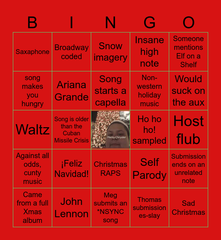 This bingo card has a free space and 74 words: Mariah Carey, Bells in the song, Snow imagery, Run DMC, Not a Christmas song, Could take place on another holiday, Can be linked to Club Penguin, Santa Claus name drop, Came from a full Xmas album, Artist hasn't been relevant in a decade, Song is funny, Reindeer name drop, Song starts a capella, song makes you hungry, Is a cover, Song is older than the Cuban Missile Crisis, Someone's nickname is on theme, Would suck on the aux, Nostalgic song, Waltz, Ariana Grande, Broadway coded, Insane high note, Was in a movie, Sad Christmas, Chat singalong, Christmas emotes/GIFs in chat, Michael Buble, "How is this a Christmas song?", Jesus was a Carpenter, too, Someone mentions Elf on a Shelf, Hot Choccy, Alvin and the Chipmunks, Capitalism, Santa Baby cover, Thomas submission es-slay, It snows for someone tonight, Retail job during Xmas PTSD, Someone levels up, Holy essay, Batman, Meg submits an *NSYNC song, John Lennon, Sleigh ride mentioned, Snowman mentioned, Kinda evil sounding, Saxaphone, Straight up Christian hymn, ¡Feliz Navidad!, Its a remix of a song, Elves mentioned, Christmas ROCKS, Winter Jazz sesh, Host flub, Bot is a Grinch, A song sung by Muppets, The Peanuts, Christmas RAPS, "Gay apparel, lol", Rae submits a weird one, Submission ends on an unrelated note, Non-western holiday music, Bingo Committee rigs a square, Against all odds, cunty music, RR host podcast, Ho ho ho! sampled, British Man, Holly, Jolly duet, Location song (Christmas in ____), Self Parody, Manger mentioned, Gratuitous Latin, It's off the A Very Special Christmas album (1987), The Drummer Boy must be on this one and Christmas POPS!.
