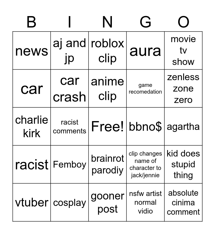This bingo card has a free space and 24 words: Femboy, cosplay, anime clip, vtuber, movie tv show, news, car, aj and jp, bbno$, brainrot parodiy, game recomedation, charlie kirk, clip changes name of character to jack/jennie, kid does stupid thing, car crash, nsfw artist normal vidio, agartha, roblox clip, zenless zone zero, racist comments, absolute cinima comment, racist, aura and gooner post.