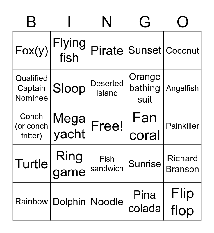 This bingo card has a free space and 24 words: Ring game, Dolphin, Deserted Island, Rainbow, Coconut, Fox(y), Qualified Captain Nominee, Flying fish, Fan coral, Fish sandwich, Orange bathing suit, Conch (or conch fritter), Sunrise, Richard Branson, Sloop, Pina colada, Painkiller, Pirate, Angelfish, Mega yacht, Flip flop, Turtle, Sunset and Noodle.