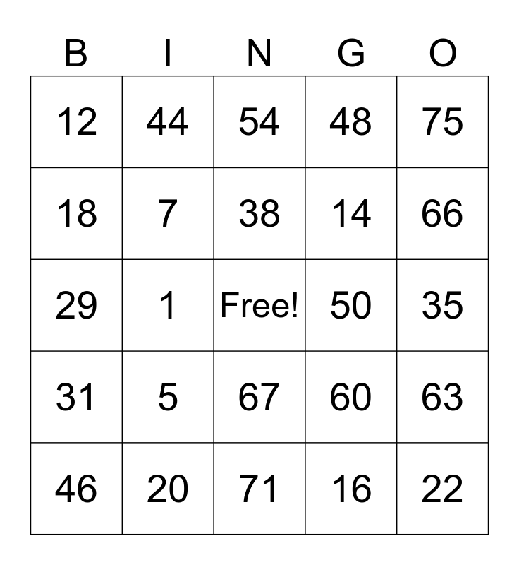 This bingo card has a free space and 24 words: 5, 20, 38, 46, 75, 12, 18, 44, 50, 67, 14, 29, 60, 63, 7, 16, 35, 54, 66, 1, 22, 31, 48 and 71.