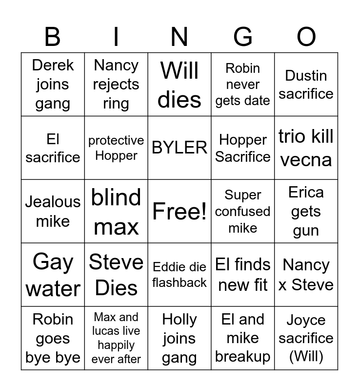This bingo card has a free space and 24 words: Steve Dies, Max and lucas live happily ever after, BYLER, Robin goes bye bye, Dustin sacrifice, Derek joins gang, El sacrifice, Nancy rejects ring, Super confused mike, Eddie die flashback, Hopper Sacrifice, Jealous mike, El finds new fit, Nancy x Steve, protective Hopper, El and mike breakup, Erica gets gun, Will dies, trio kill vecna, blind max, Joyce sacrifice (Will), Gay water, Robin never gets date and Holly joins gang.