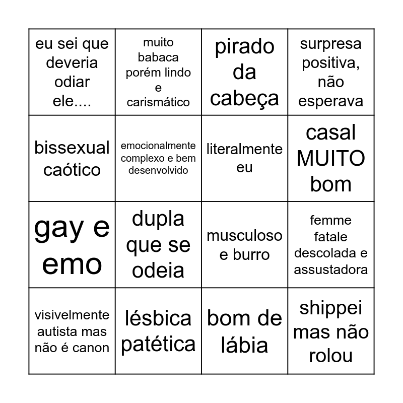 This bingo card has 16 words: lésbica patética, femme fatale descolada e assustadora, pirado da cabeça, eu sei que deveria odiar ele...., gay e emo, muito babaca porém lindo e carismático, musculoso e burro, bom de lábia, bissexual caótico, emocionalmente complexo e bem desenvolvido, visivelmente autista mas não é canon, surpresa positiva, não esperava, dupla que se odeia, casal MUITO bom, literalmente eu and shippei mas não rolou.