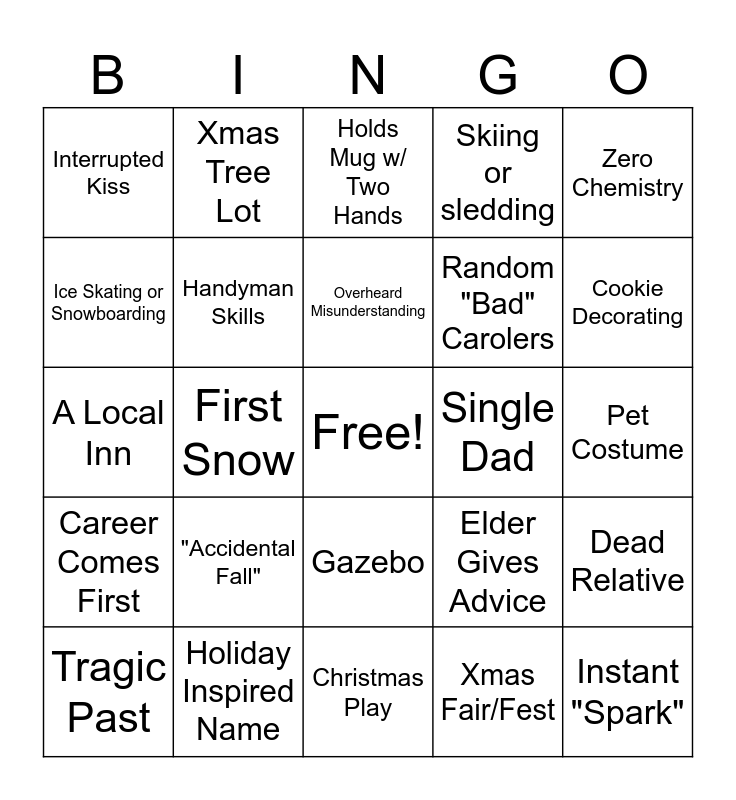 This bingo card has a free space and 30 words: Holiday Inspired Name, Big Dead Line, First Snow, Travel Issues, Interrupted Kiss, Holds Mug w/ Two Hands, Handyman Skills, Gazebo, Single Dad, Christmas Play, Pet Costume, Instant "Spark", Xmas Fair/Fest, Red Dress, Cookie Decorating, Sant in Disguise, Elder Gives Advice, Career Comes First, "Accidental Fall", Zero Chemistry, A Local Inn, "Quaint", Xmas Tree Lot, Random "Bad" Carolers, Ice Skating or Snowboarding, Skiing or sledding, Dead Relative, Tragic Past, Overheard Misunderstanding and Scrooge Character.