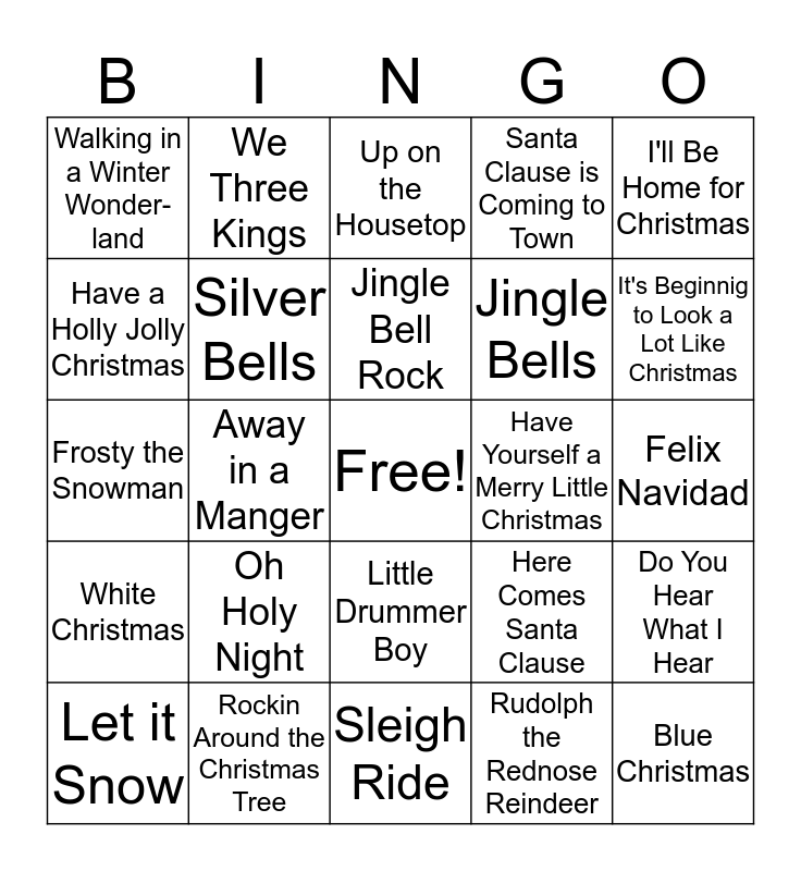 This bingo card has a free space and 24 words: Oh Holy Night, Rockin Around the Christmas Tree, Jingle Bell Rock, Let it Snow, I'll Be Home for Christmas, Walking in a Winter Wonder-land, Have a Holly Jolly Christmas, We Three Kings, Have Yourself a Merry Little Christmas, Little Drummer Boy, Jingle Bells, Frosty the Snowman, Here Comes Santa Clause, Do You Hear What I Hear, Silver Bells, Rudolph the Rednose Reindeer, Felix Navidad, Up on the Housetop, It's Beginnig to Look a Lot Like Christmas, Away in a Manger, Blue Christmas, White Christmas, Santa Clause is Coming to Town and Sleigh Ride.