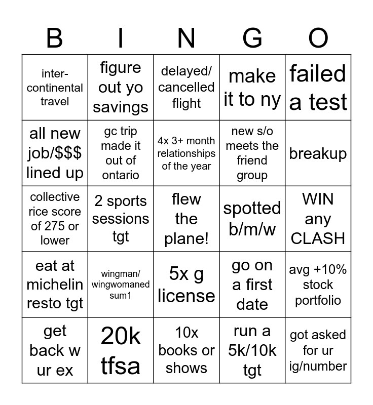 This bingo card has a free space and 24 words: wingman/ wingwomaned sum1, 20k tfsa, 4x 3+ month relationships of the year, get back w ur ex, failed a test, inter- continental travel, all new job/$$$ lined up, figure out yo savings, spotted b/m/w, 5x g license, new s/o meets the friend group, collective rice score of 275 or lower, go on a first date, avg +10% stock portfolio, gc trip made it out of ontario, run a 5k/10k tgt, WIN any CLASH, delayed/ cancelled flight, breakup, 2 sports sessions tgt, got asked for ur ig/number, eat at michelin resto tgt, make it to ny and 10x books or shows.