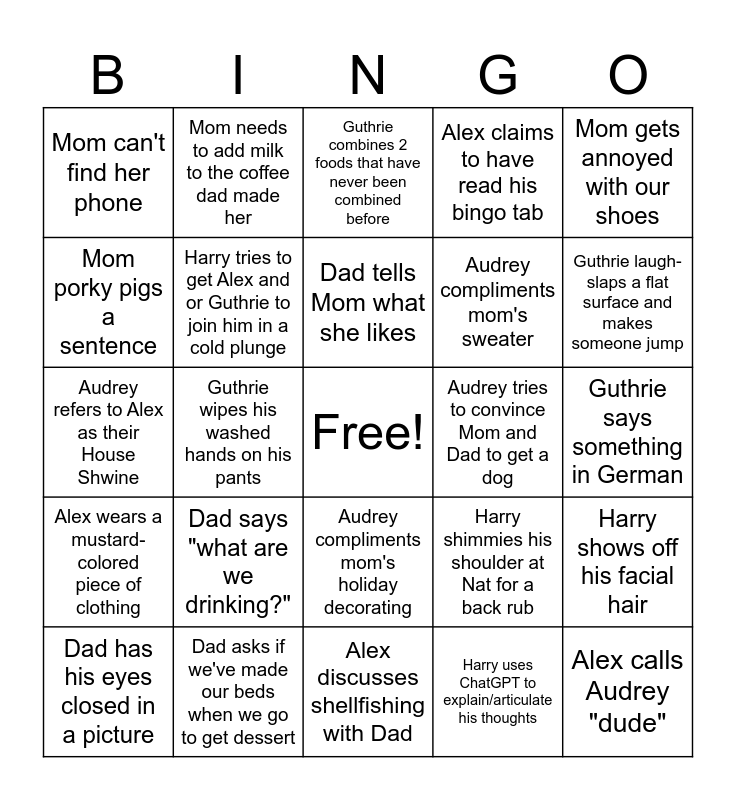 This bingo card has a free space and 24 words: Dad says "what are we drinking?", Dad asks if we've made our beds when we go to get dessert, Dad tells Mom what she likes, Dad has his eyes closed in a picture, Mom gets annoyed with our shoes, Mom can't find her phone, Mom porky pigs a sentence, Mom needs to add milk to the coffee dad made her, Audrey tries to convince Mom and Dad to get a dog, Audrey compliments mom's holiday decorating, Audrey compliments mom's sweater, Audrey refers to Alex as their House Shwine, Harry shimmies his shoulder at Nat for a back rub, Harry shows off his facial hair, Harry tries to get Alex and or Guthrie to join him in a cold plunge, Harry uses ChatGPT to explain/articulate his thoughts, Guthrie says something in German, Guthrie combines 2 foods that have never been combined before, Guthrie laugh-slaps a flat surface and makes someone jump, Guthrie wipes his washed hands on his pants, Alex calls Audrey "dude", Alex wears a mustard-colored piece of clothing, Alex claims to have read his bingo tab and Alex discusses shellfishing with Dad.