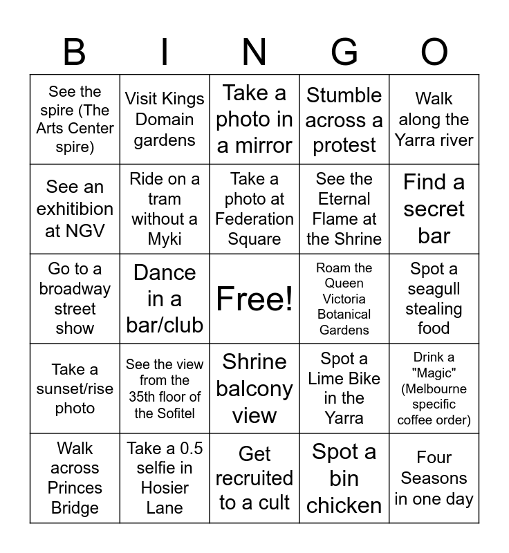 This bingo card has a free space and 24 words: See the view from the 35th floor of the Sofitel, Take a 0.5 selfie in Hosier Lane, Take a photo at Federation Square, Walk across Princes Bridge, Walk along the Yarra river, See the spire (The Arts Center spire), See an exhitibion at NGV, Visit Kings Domain gardens, Roam the Queen Victoria Botanical Gardens, Shrine balcony view, See the Eternal Flame at the Shrine, Go to a broadway street show, Spot a Lime Bike in the Yarra, Drink a "Magic" (Melbourne specific coffee order), Ride on a tram without a Myki, Spot a bin chicken, Spot a seagull stealing food, Take a photo in a mirror, Find a secret bar, Dance in a bar/club, Four Seasons in one day, Take a sunset/rise photo, Stumble across a protest and Get recruited to a cult.