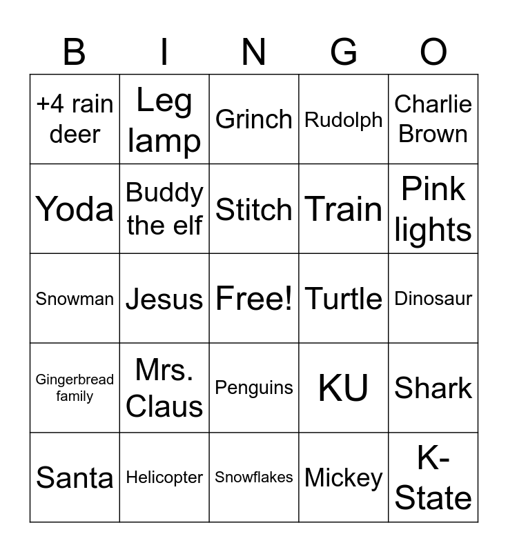 This bingo card has a free space and 25 words: Santa, Mrs. Claus, Stitch, Mickey, Pink lights, +4 rain deer, Leg lamp, Grinch, Train, Shark, Snowman, Buddy the elf, KU, K-State, Yoda, Helicopter, Snowflakes, Rudolph, Dinosaur, Gingerbread family, Jesus, Penguins, Turtle, Charlie Brown and Bells.