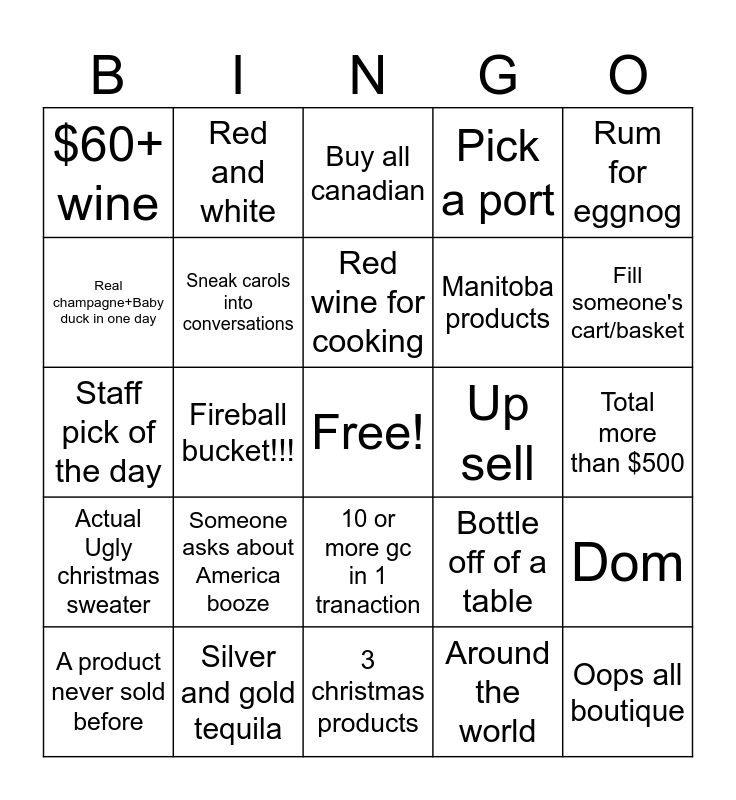 This bingo card has a free space and 25 words: Someone asks about America booze, 3 christmas products, Red wine for cooking, A product never sold before, Rum for eggnog, $60+ wine, Real champagne+Baby duck in one day, Red and white, Up sell, 10 or more gc in 1 tranaction, Manitoba products, Staff pick of the day, Bottle off of a table, Dom, Sneak carols into conversations, Anything but baileys, Total more than $500, Buy all canadian, Fill someone's cart/basket, Fireball bucket!!!, Oops all boutique, Silver and gold tequila, Actual Ugly christmas sweater, Pick a port and Around the world.