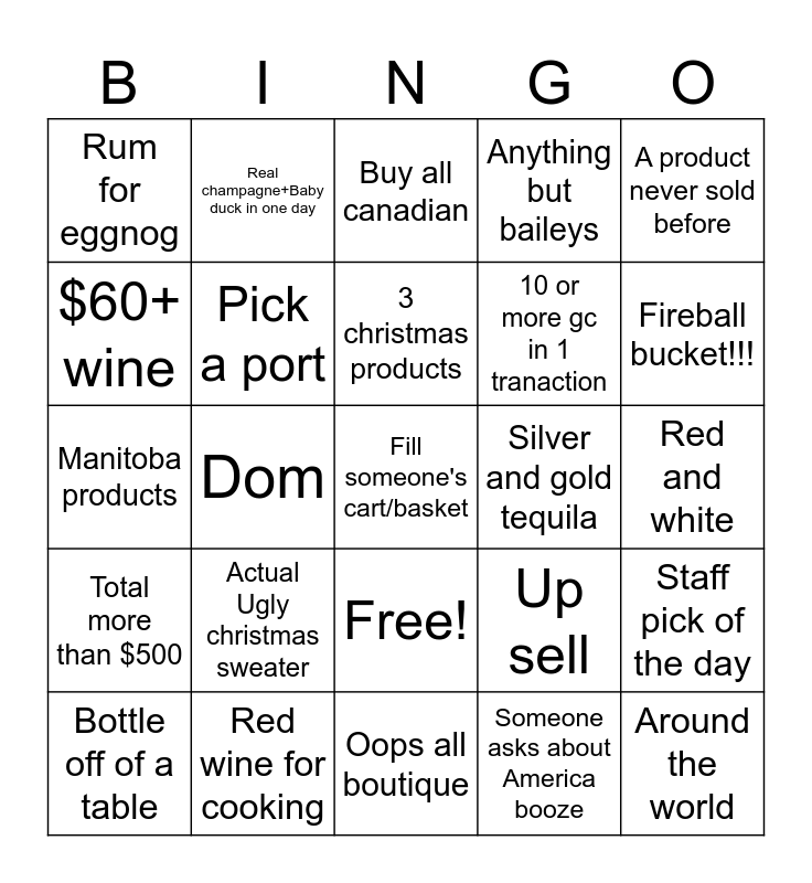 This bingo card has 26 words: Free!, Someone asks about America booze, 3 christmas products, Red wine for cooking, A product never sold before, Rum for eggnog, $60+ wine, Real champagne+Baby duck in one day, Red and white, Up sell, 10 or more gc in 1 tranaction, Manitoba products, Staff pick of the day, Bottle off of a table, Dom, Sneak carols into conversations, Anything but baileys, Total more than $500, Buy all canadian, Fill someone's cart/basket, Fireball bucket!!!, Oops all boutique, Silver and gold tequila, Actual Ugly christmas sweater, Pick a port and Around the world.