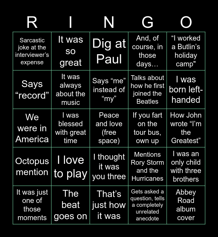 This bingo card has a free space and 28 words: I was an only child with three brothers, Rooftop concert, Talks about how he first joined the Beatles, Gets asked a question, tells a completely unrelated anecdote, Says “record”, Dig at Paul, It was so great, Octopus mention, If you fart on the tour bus, own up, It was just one of those moments, We were in America, And, of course, in those days…, The beat goes on, That’s just how it was, I was born left-handed, Vocal imitation of instruments, I love to play, It was always about the music, Says “me” instead of “my”, I thought it was you three, Sarcastic joke at the interviewer’s expense, You know, Abbey Road album cover, I was blessed with great time, How John wrote “I’m the Greatest”, Mentions Rory Storm and the Hurricanes, “I worked a Butlin’s holiday camp" and Brian Epstein mention.