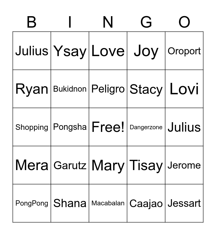 This bingo card has a free space and 49 words: JB, Jessart, Agoho, Macabalan, Garutz, Patricia, Ysay, Kix, Ryan, Love, Bukidnon, Joy, Jerome, Tisay, Lola Berta, Art, Peligro, Dangerzone, Jayjay, Oroport, Pongsha, Caajao, Julius, Stacy, Mera, Lovi, PongPong, Jerome, Mary, Mera, Tisay, Riz, Sakristan, Oliver, Shana, Caajao, Jaquilyn, Ysay, Julius, Kikay, Bukidnon, Aurina, Joy, Art, Shopping, Love, Kix, Hope and Arthuro.