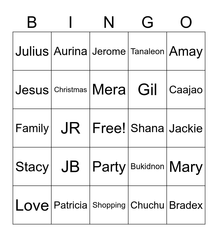 This bingo card has a free space and 25 words: JB, Shopping, Mera, Love, Amay, Julius, Jesus, Aurina, Shana, Party, Gil, Family, Bukidnon, Mary, Christmas, Camiguin, Jackie, Jerome, Caajao, JR, Bradex, Patricia, Stacy, Tanaleon and Chuchu.