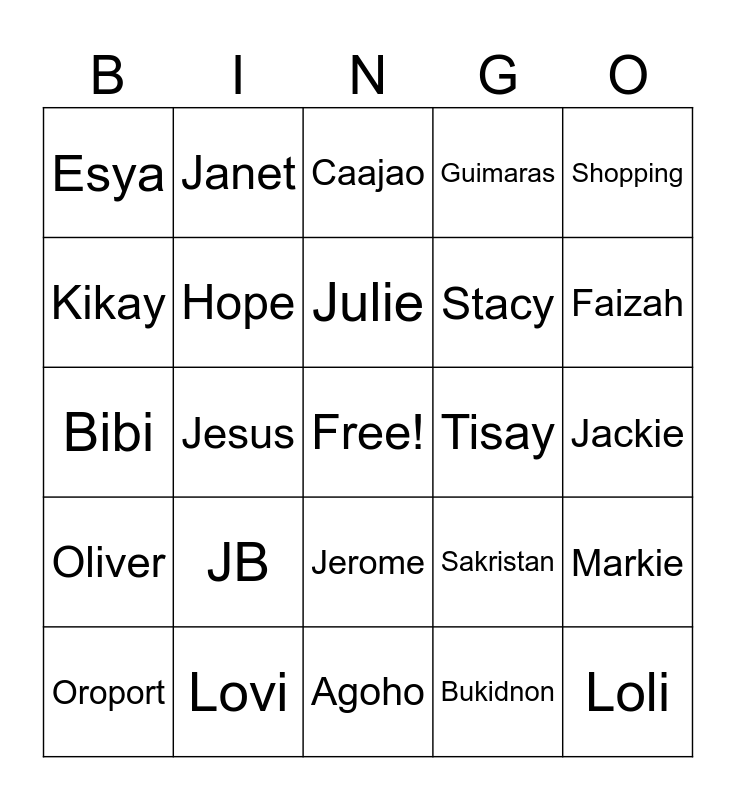 This bingo card has a free space and 25 words: JB, Agoho, Julie, Oroport, Shopping, Esya, Kikay, Janet, Tisay, Jerome, Stacy, Bibi, Sakristan, Markie, Hope, Xavier, Jackie, Caajao, Faizah, Jesus, Loli, Lovi, Oliver, Guimaras and Bukidnon.