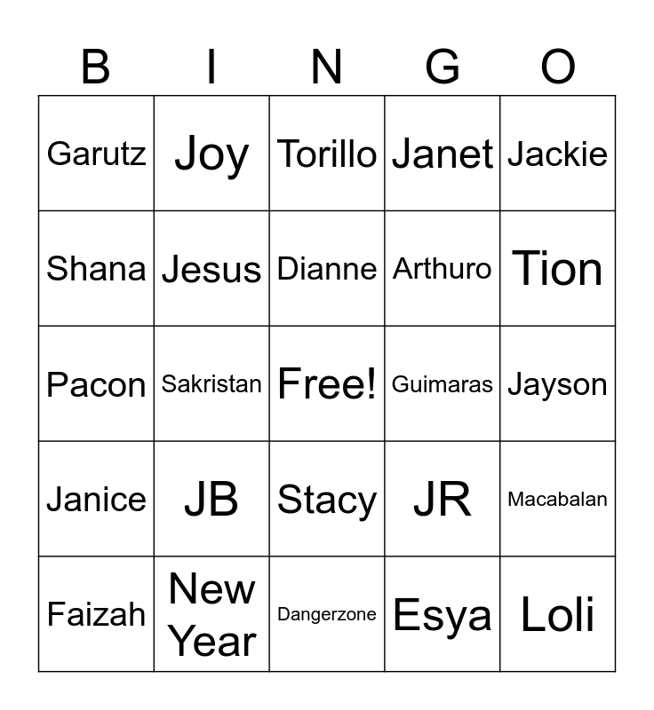 This bingo card has a free space and 25 words: JB, Dangerzone, Dianne, Faizah, Jackie, Garutz, Shana, Joy, Guimaras, Stacy, Arthuro, Pacon, JR, Macabalan, Jesus, Jaquilyn, Jayson, Torillo, Tion, Sakristan, Loli, New Year, Janice, Janet and Esya.