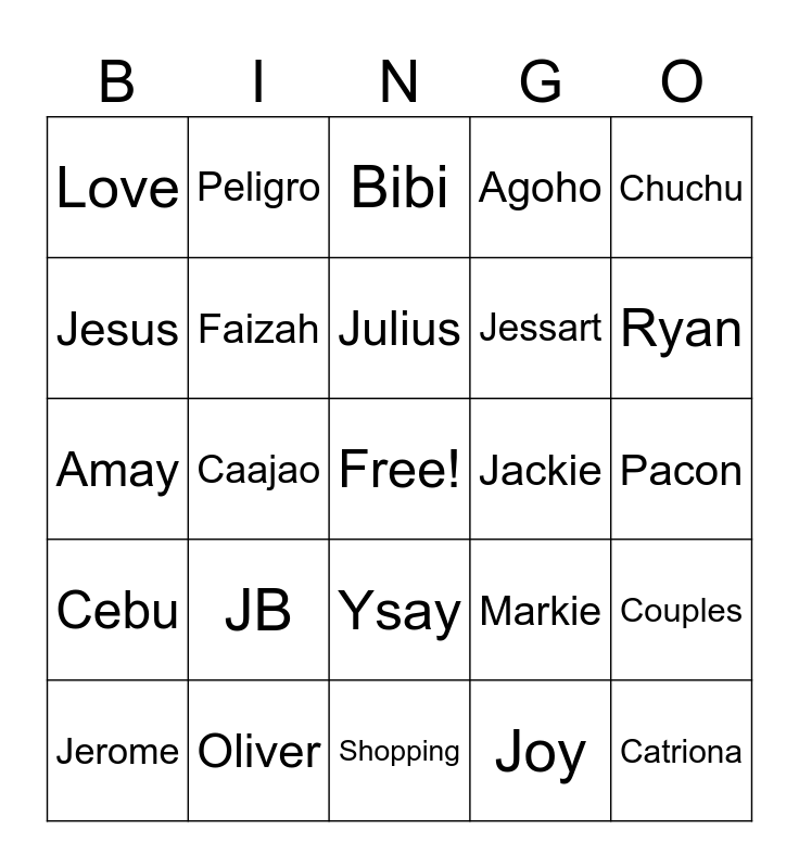 This bingo card has a free space and 25 words: JB, Shopping, Julius, Jerome, Chuchu, Love, Jesus, Peligro, Jackie, Ysay, Jessart, Amay, Markie, Couples, Faizah, Patricia, Pacon, Bibi, Ryan, Caajao, Catriona, Oliver, Cebu, Agoho and Joy.