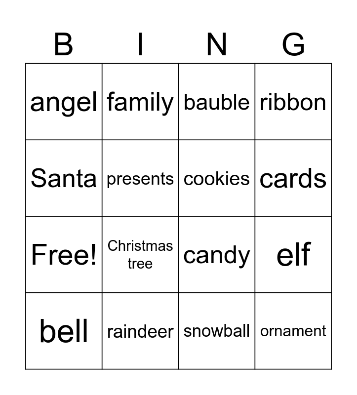 This bingo card has 20 words: elf, star, bauble, snow, bell, Santa, raindeer, angel, Free!, family, Christmas tree, candy, presents, ornament, cookies, snowman, cards, ribbon, snowball and stocking.