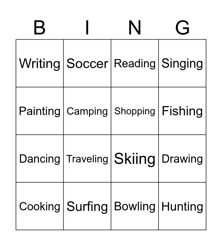 This bingo card has 16 words: Surfing, Drawing, Reading, Writing, Dancing, Soccer, Skiing, Bowling, Painting, Camping, Cooking, Singing, Traveling, Fishing, Shopping and Hunting.