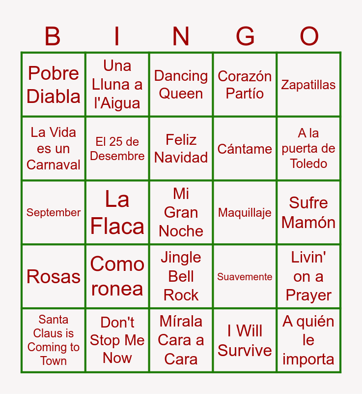 This bingo card has a free space and 39 words: All I Want for Christmas Is You, Last Christmas, Quan somrius, El 25 de Desembre, Santa Claus is Coming to Town, Jingle Bell Rock, Feliz Navidad, Bulería, Zapatillas, Rosas, La Flaca, Corazón Partío, A quién le importa, Sufre Mamón, Maquillaje, Como ronea, Gasolina, Pobre Diabla, Bailando, Suavemente, La Vida es un Carnaval, Mírala Cara a Cara, Cántame, A la puerta de Toledo, Coti x Coti, Bailoteo, L'Empordà, Boig per Tu, Bon Dia, Una Lluna a l'Aigua, Vull estar amb tu, Corren, Dancing Queen, Don't Stop Me Now, I Will Survive, Wannabe, Livin' on a Prayer, September and Happy.