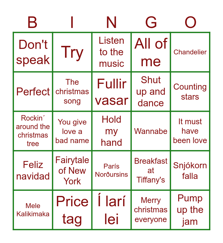 This bingo card has 75 words: Mýrdalssandur, Allt eða ekkert, Fullir vasar, Ég veit þú kemur, Leiðin okkar allra, Malbik, Það er gott að elska, Betri tíð, Þú ert mín, Í fjarlægð, Parísarhjól, Þúsund hjörtu, París Norðursins, Shut up and dance, Can't walk away, Perfect, Price tag, Í larí lei, Blurred lines, Counting stars, Diamonds, Try, Hold my hand, All of me, Chandelier, I kissed a girl, Shallow, Hello, One, Dear future husband, Losing my religion, This love, Lady Marmalade, Breakfast at Tiffany's, It must have been love, Don't speak, What's up?, Shape of my heart, Wannabe, Pump up the jam, Another brick in the wall, Knockin' on heaven's door, It's my life, Your song, Man! I feel like a woman, Livin' on a prayer, You give love a bad name, Listen to the music, The final countdown, Father and son, Please come home for christmas, The christmas song, Paradise City, Er líða fer að jólum, Another one bites the dust, Underneath the tree, Winter wonderland, Driving home for christmas, Litli trommuleikarinn, Dansaðu vindur, Mele Kalikimaka, Do they know it's christmas?, Santa baby, Hátíð í bæ, Run Rudolph run, Rockin´ around the christmas tree, Snowman, Santa claus is coming to town, Mary's boy child, Snjókorn falla, Feliz navidad, Fairytale of New York, Desember, Merry christmas everyone and Last christmas.