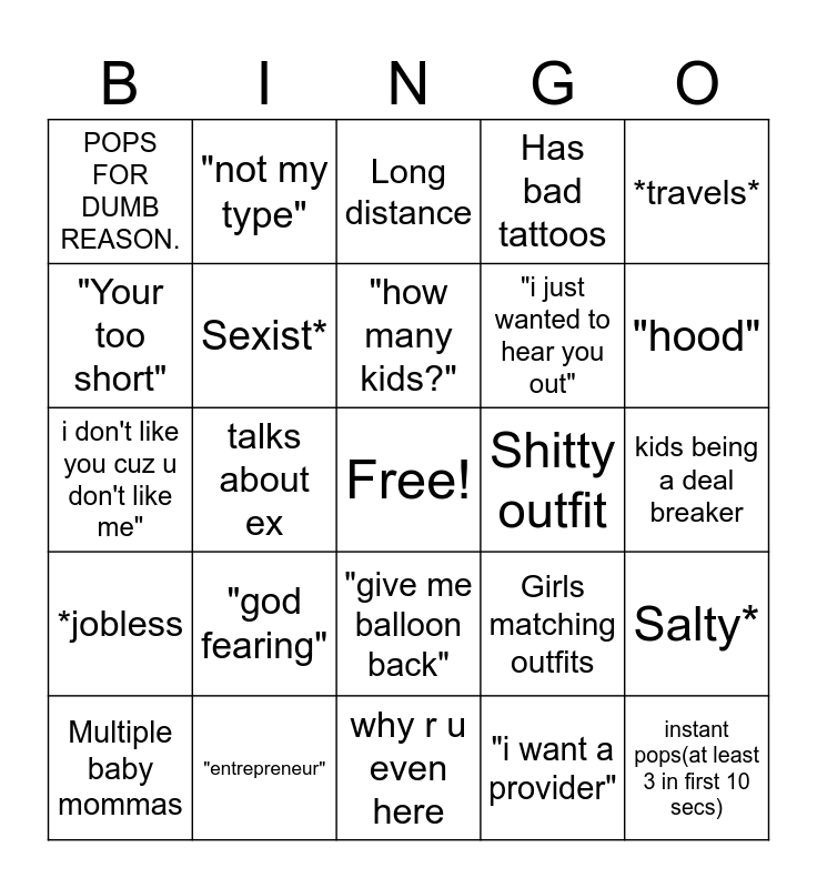 This bingo card has a free space and 24 words: "god fearing", "entrepreneur", "how many kids?", Multiple baby mommas, *travels*, POPS FOR DUMB REASON., "Your too short", "not my type", Shitty outfit, "give me balloon back", "i just wanted to hear you out", i don't like you cuz u don't like me", Girls matching outfits, Salty*, Sexist*, "i want a provider", kids being a deal breaker, Long distance, "hood", talks about ex, instant pops(at least 3 in first 10 secs), *jobless, Has bad tattoos and why r u even here.
