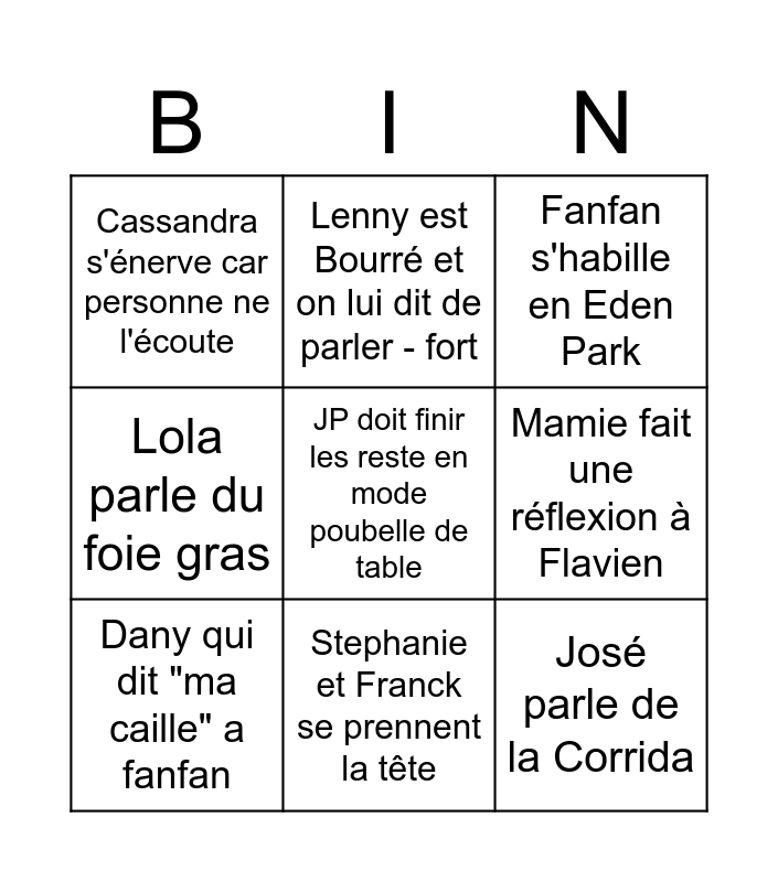 This bingo card has a free space and 8 words: Mamie fait une réflexion à Flavien, Fanfan s'habille en Eden Park, Lenny est Bourré et on lui dit de parler - fort, Dany qui dit "ma caille" a fanfan, Cassandra s'énerve car personne ne l'écoute, José parle de la Corrida, Lola parle du foie gras and Stephanie et Franck se prennent la tête.