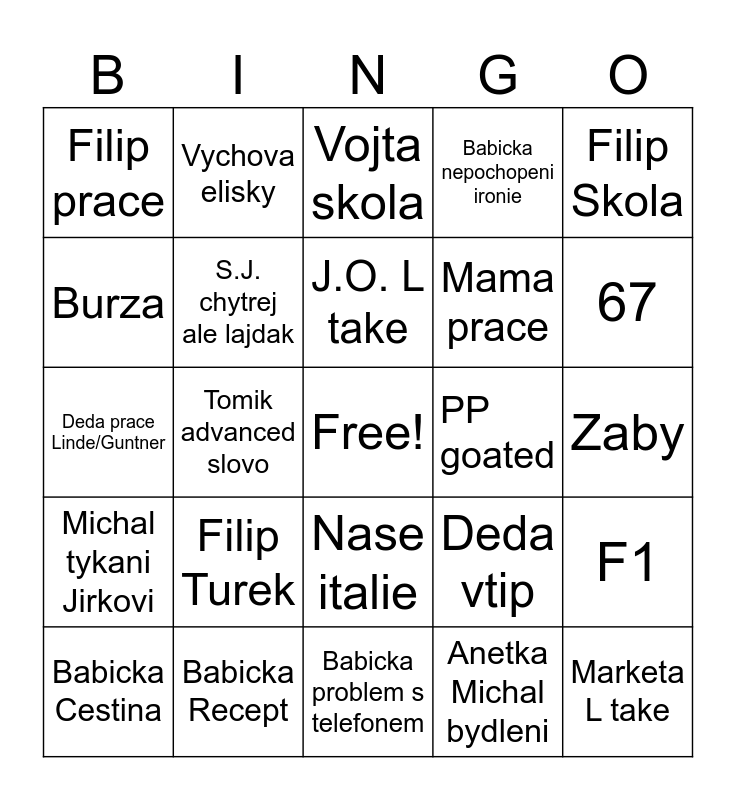 This bingo card has a free space and 24 words: Filip Turek, Babicka Recept, J.O. L take, Babicka Cestina, Filip Skola, Filip prace, Burza, Vychova elisky, PP goated, Nase italie, Mama prace, Deda prace Linde/Guntner, Deda vtip, F1, S.J. chytrej ale lajdak, Anetka Michal bydleni, Zaby, Vojta skola, 67, Tomik advanced slovo, Marketa L take, Michal tykani Jirkovi, Babicka nepochopeni ironie and Babicka problem s telefonem.