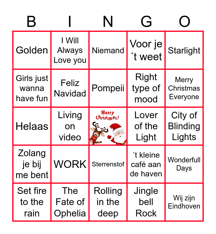 This bingo card has a free space and 44 words: Thunderstruck, Wij zijn Eindhoven, Am I Wrong, Set fire to the rain, Verdronken Vlinder, Jingle bell Rock, Niemand, Driving home for Christmas, Starlight, The Fate of Ophelia, Voor je ´t weet, Lover of the Light, Sterrenstof, WORK, Baila de Gasolina, Rolling in the deep, Jackson, Helaas, PSV wat ben je mooi, Merry Christmas Everyone, I Will Always Love you, Huisfeestje, Whiskey in the jar, Golden, BamBam, City of Blinding Lights, This world is our home, Brianrot Rap, ´t kleine café aan de haven, Zolang je bij me bent, Lush Life, Wonderfull Days, Dochters, ´t is moeilijk bescheiden te blijven, Living on video, Hello, Phantom of the opera, Flappie, Pompeii, Girls just wanna have fun, Right type of mood, Merry Christmas Everybody, Feliz Navidad and Beuk de ballen uit de boom.